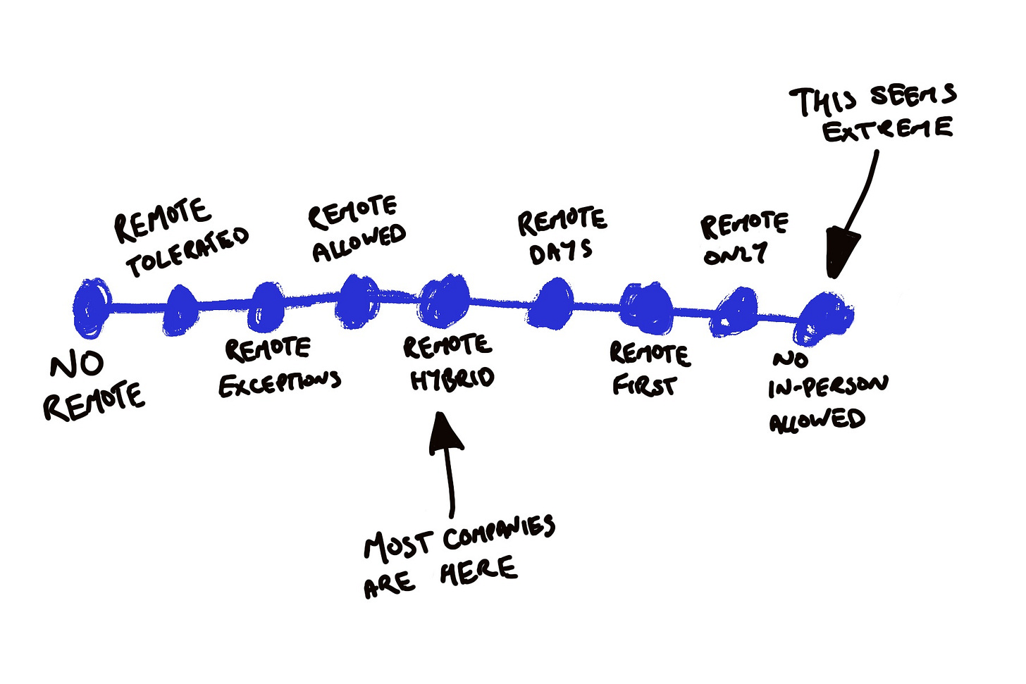 Most tech companies say they hire for “remote hybrid” but the reality is they can sit anywhere from “remote tolerated” to “remote first”. And you likely won’t know until you get into the hiring process.